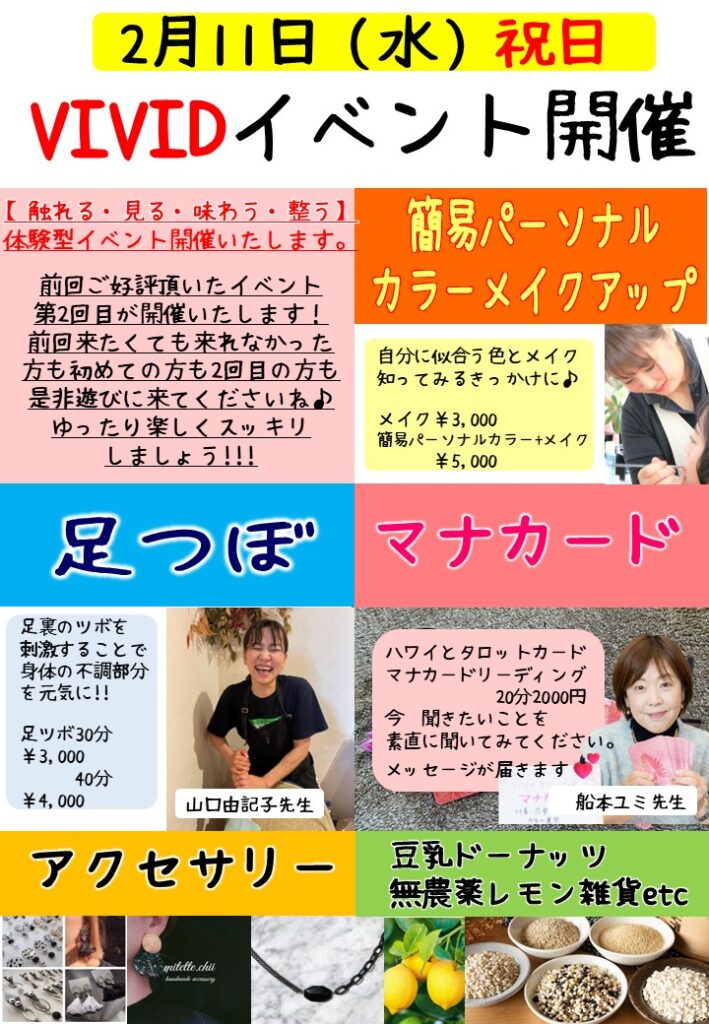 さてVIVIDは去年開催した足ツボ・占い・物販のイベントが好評だったため今年も開催いたします!!!!!